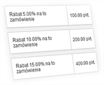 Jeżeli posiadasz już na swoim koncie punkty lojalnościowe możesz je wymienić na rabat dla składanego zamówienia. Wielkość rabatu uzależniona jest od zgromadzonych punktów na koncie.